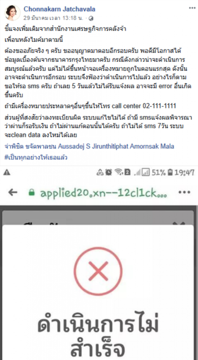 ดังนั้น อาจจะดำเนินการอีกรอบระบบจึงฟ้องว่าดำเนินการไปแล้ว อย่างไรก็ตาม ขอให้รอ sms ครับ ถ้าเลย 5 วันแล้วไม่ได้รับแจ้งผล อาจจะมี error อื่นเกิดขึ้นครับ ถ้ามีเครื่องหมายประหลาดๆ อื่นๆ ขึ้นให้โทร call center 02-111-1111 หรือ ส่วนผู้ที่สงสัยว่าลงทะเบียนผิด ระบบแก้ไขไม่ได้ ถ้ามี sms แจ้งผลพิจารณาว่าผ่านก็รอรับเงิน ถ้าไม่ผ่านแก้ตอนนั้นได้ครับ
