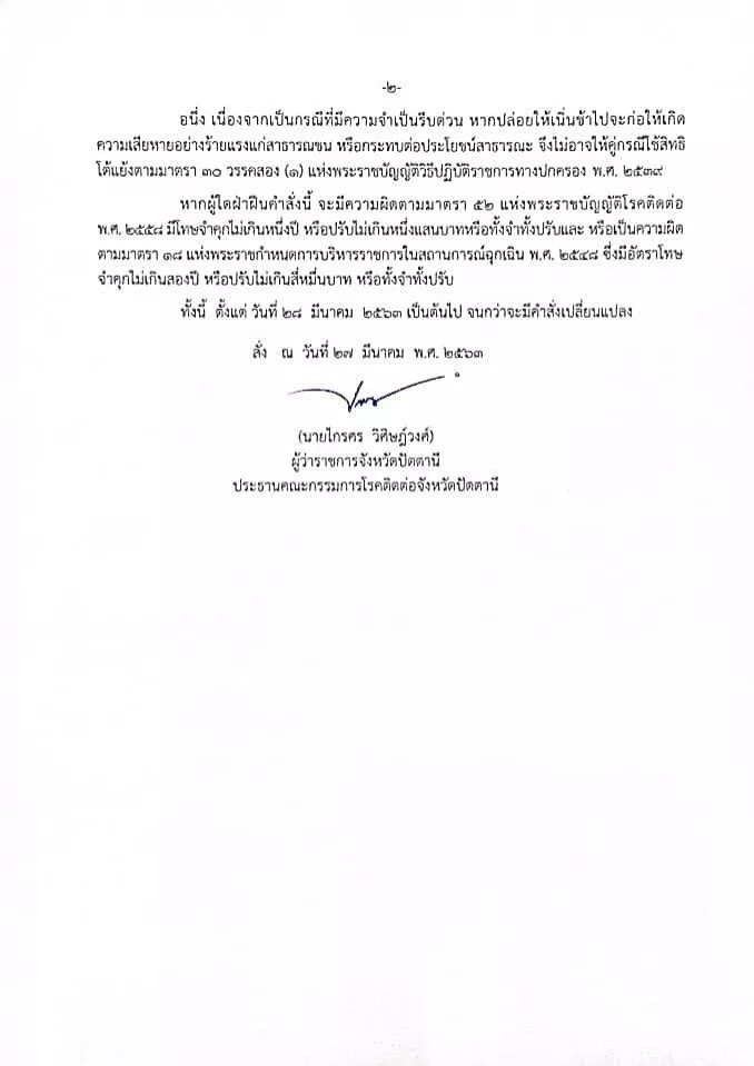 2. ห้ามผู้ที่เป็น หรือมีเหตุอันควรสงสัยว่าเป็นโรคติดต่ออันตราย หรือโรคระบาด เดินทาง เข้า ออก จากหมู่บ้านหรือที่เอกเทศ สำหรับที่แยกกัน หรือกักกัน และหรือข้ามเขตพื้นที่จังหวัดปัตตานี เว้นแต่ ได้รับอนุญาตจากเจ้าพนักงานควบคุมโรคติดต่อ