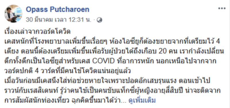 ผศ.นพ.โอภาส พุทธเจริญ ภาควิชาอายุรศาสตร์ คณะแพทยศาสตร์ จุฬาลงกรณ์มหาวิทยาลัย หัวหน้าศูนย์ความเป็นเลิศทางการแพทย์ โรคอุบัติใหม่ด้านคลินิก โรงพยาบาลจุฬาลงกรณ์ สภากาชาดไทย โพสต์เฟซบุ๊ก Opass Putcharoen เล่าเรื่องจากวอร์ดโควิด โดยระบุว่า เคสหนักที่โรงพยาบาล เพิ่มขึ้นเรื่อยๆ ห้องไอซียูก็ต้องขยายจากที่เตรียมไว้ 4 เตียง ตอนนี้ต้องเตรียมรับผู้ป่วยให้ได้ถึงเกือบ 20 คน