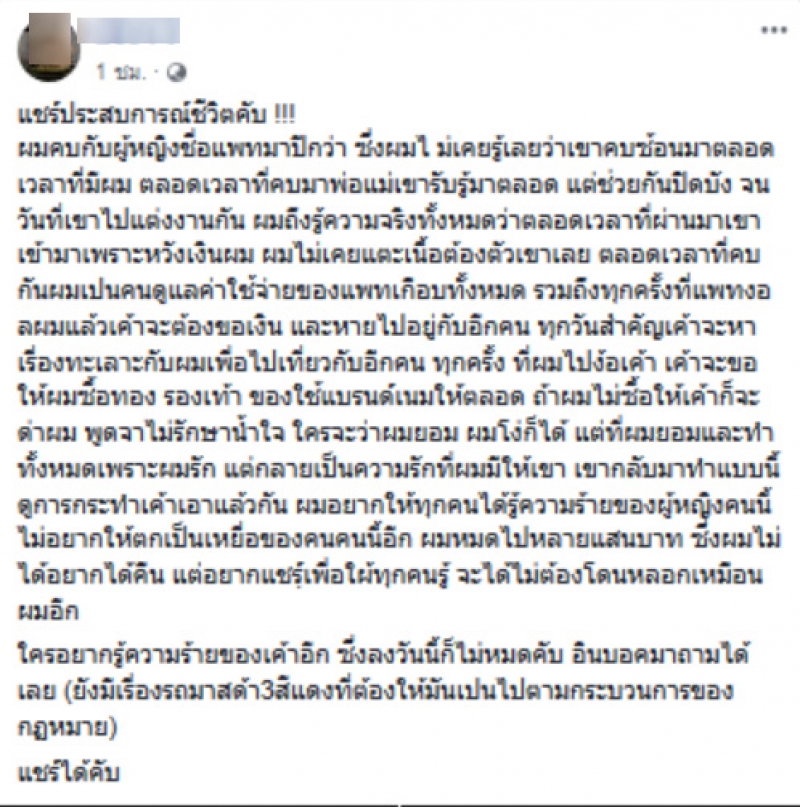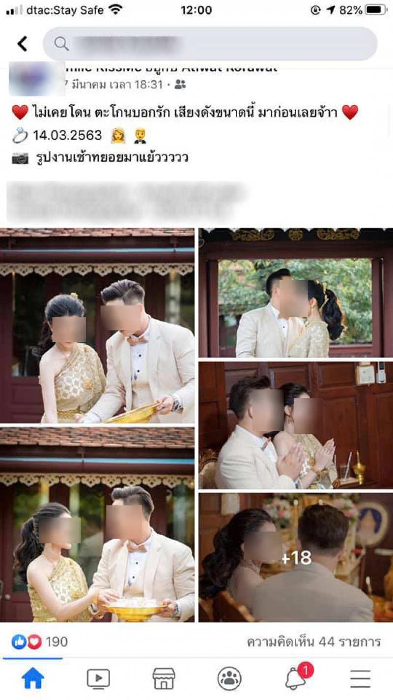เรียกได้ว่าเป็นเรื่องราวที่มีคนแห่เข้ามาแสดงความคิดเห็นกันเป็นจำนวนมาก สำหรับเรื่องราวของความรักของหนุ่มรายหนึ่ง ที่ได้คบกันสาวรายหนึ่ง แต่ตลอดเวลาที่คบกันมาไม่เคยรรู้ว่าผู้หญิงคนนี้มีผู้ชายอีกคน จนวันที่เขาแต่งงาน โดยผู้ใช้เฟสบุ๊ครายหนึ่งได้โพสต์เล่าเรื่องราวทั้งหมดพร้อมข้อความระบุว่า