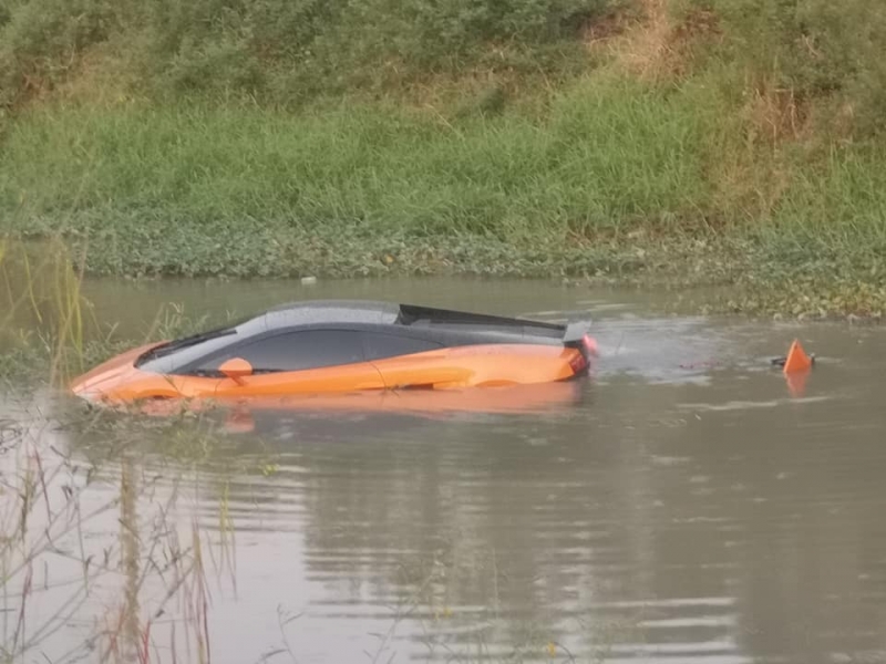 รถยนต์เก๋ง ยี่ห้อหรู ลัมโบร์กีนีไม่ทราบหมายเลขทะเบียน อยู่ในคลอง ทราบเบื้องต้นจากพลเมืองดีว่า ผู้ขับขี่เป็นชาย อายุประมาณ 34-40 ปี ออกมาจากรถได้และมีคนช่วยเหลือนำส่งโรงพยาบาลธัญบุรี มีอาการจุกแน่นที่หน้าอก