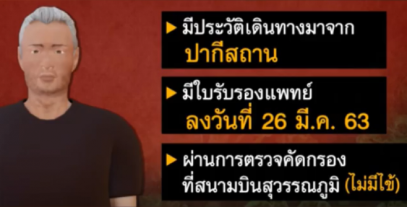 นายกิตติพงษ์ กิตติขจร รองผู้อำนวยการท่าอากาศยาสุวรรณภูมิ ฝ่ายปฎิบัติการ บริษัท ท่าอากาศยานไทย จำกัด(มหาชน) หรือ ทอท.เปิดเผยถึงกรณีที่ชาวสุไหงโกลกอายุ57ปี ที่กลับจากปากีสถานติดเชื้อโควิด-19และเสียชีวิตบนรถไฟว่า สนามบินสุวรรณภูมิได้ทำการตรวจสอบประวัติการเดินทางของผู้ตาย พบว่า ชายคนดังกล่าวเดินทางมาจากกรุงอิสลามมาบัด ประเทศปากีสถาน ด้วยเที่ยวบิน TG350 เดินทางมาถึงไทยเวลาประมาณ 06.00น. ของวันที่ 29 มี.ค.