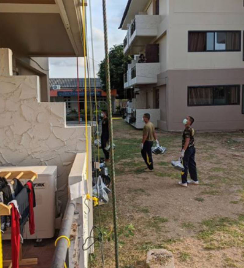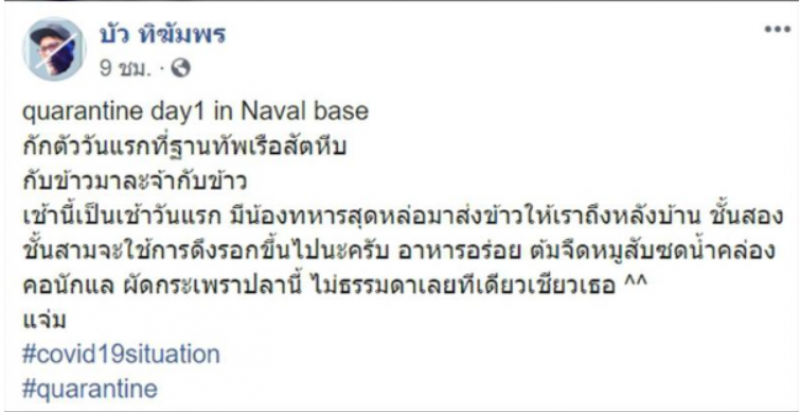 วันที่ 4 เมษายน 2563 ผู้สื่อข่าว ได้รับรายงานว่าบนโลกออนไลน์มีสมาชิกผู้ใช้เฟซบุ๊กรายหนึ่งซึ่งเป็นหนึ่งในคนไทยที่เดินทางกลับมากับกลุ่มคนไทยประเทศกลุ่มเสี่ยง ที่สนามบินสุวรรณภูมิ และจะต้องเข้าสู่มาตรการกักตัว ตาม พ ร ก ฉุกเฉินฯ และประกาศของสำนักงานการบินพลเรือน พร้อมทั้งให้การร่วมมือในการกักตัว 14 วันโดยได้โพสต์รีวิวการกักตัวในค่ายสัตหีบ ซึ่งไม่ได้แย่อย่างที่มีกระแส พร้อมระบุข้อความว่า quarantine day1 in Naval base กักตัววันแรกที่ฐานทัพเรือสัตหีบ เช้านี้เป็นเช้าวันแรก มีน้องทหารสุดหล่อมาส่งข้าวให้เราถึงหลังบ้าน ชั้นสองชั้นสามจะใช้การดึงรอกขึ้นไปนะครับ อาหารอร่อย ต้มจืดหมูสับซดน้ำคล่องคอนักแล ผัดกระเพราปลานี้ ไม่ธรรมดาเลยทีเดียวเชียวเธอ แจ่ม