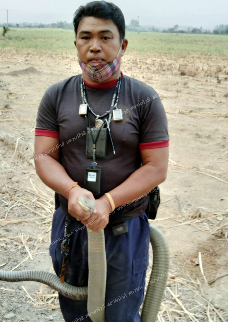 ทางด้านนิรันดร์ มั่นคง เจ้าหน้าที่มูลนิธิเสมอกัน เล่าว่าขณะกำลังทำงานอยู่ที่บ้านได้รับการประสานจากเจ้าหน้าที่ศูนย์วิทยุของมูลนิธิเสมอกันว่ามีชาวบ้านแจ้งมาขอให้ช่วยไปจับสัตว์เลื้อยคลานประเภทงูซึ่งยังไม่ทราบชนิด จึงประสานกำลังนำอุปกรณ์เดินทางไปตรวจสอบหลังจากทำการตรวจสอบแล้วพบว่าเจ้าอสรพิษคืองูจงอาง ขนาดใหญ่ซึ่งมีพิษร้ายแรงหากพลาดถูกกัดช่วยไม่ทันมีสิทธิ์เสียชีวิตสถานเดียว