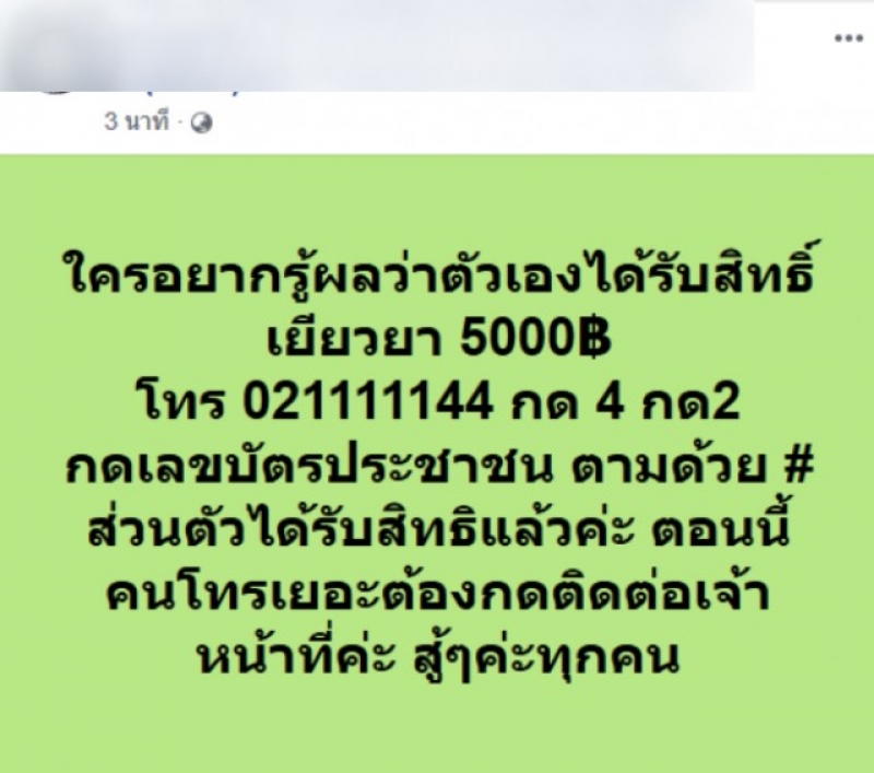 ล่าสุด ผู้ใช้เฟสบุ๊คท่านหนึ่ง ได้โพสต์แบ่งปันข้อมูลการเช็คว่าตัวเองได้รับสิทธิ์รับเงินช่วยเหลือไหมมีวิธีเช็คอย่างไร โดยโพสต์ข้อความระบุว่า ใครอยากรู้ผลว่าตัวเองได้รับสิทธิ์เงินช่วยเหลือ 5000 บาท โทร 021-111-144 กด 4 กด 2 กดเลขบัตรประชาชน ตามด้วยเครื่องหมายสี่เหลี่ยม หรือชาร์ป ส่วนตัวได้รับสิทธิแล้วค่ะ ตอนนี้คนโทรเยอะต้องกดติดต่อเจ้าหน้าที่ค่ะ สู้ๆค่ะทุกคน